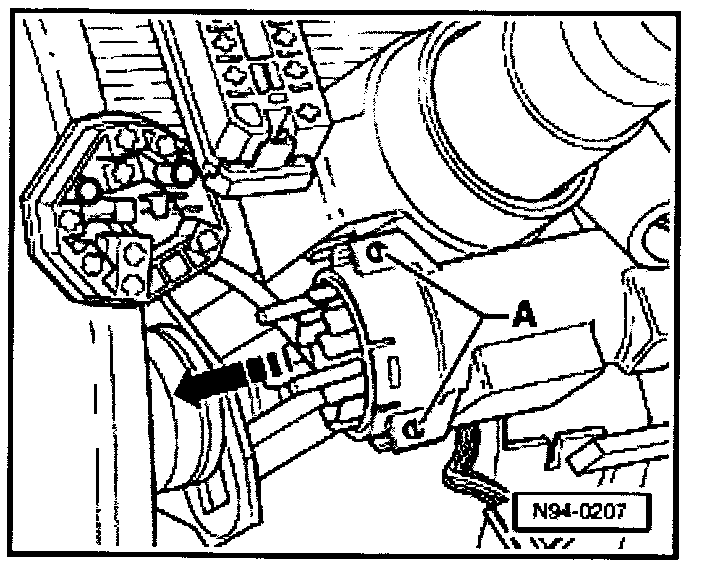 - Loosen the two screws -A- slightly and pull ignition/starter switch out from steering lock housing in direction of arrow.