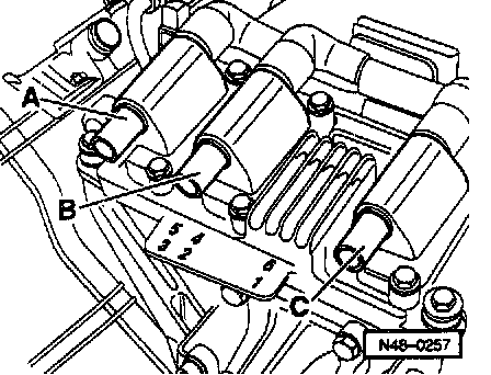 - Match ignition wires 6 and 1 to ignition coil -C-.