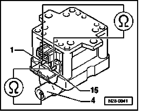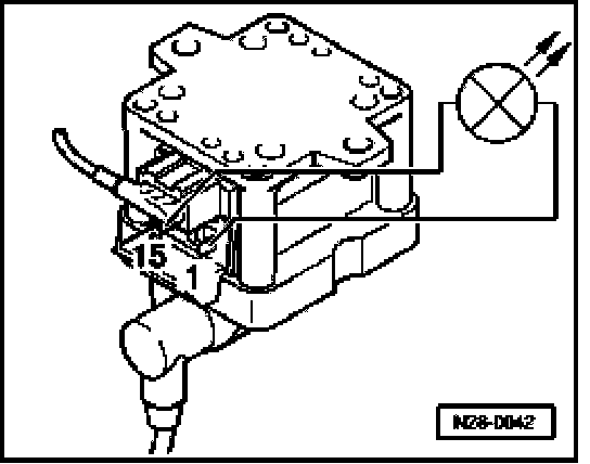 - Connect diode test lamp VAG 1527 using aux. cables from VAG 1594 and adapters VAG 1594/15 to contacts 2+3 of connector.