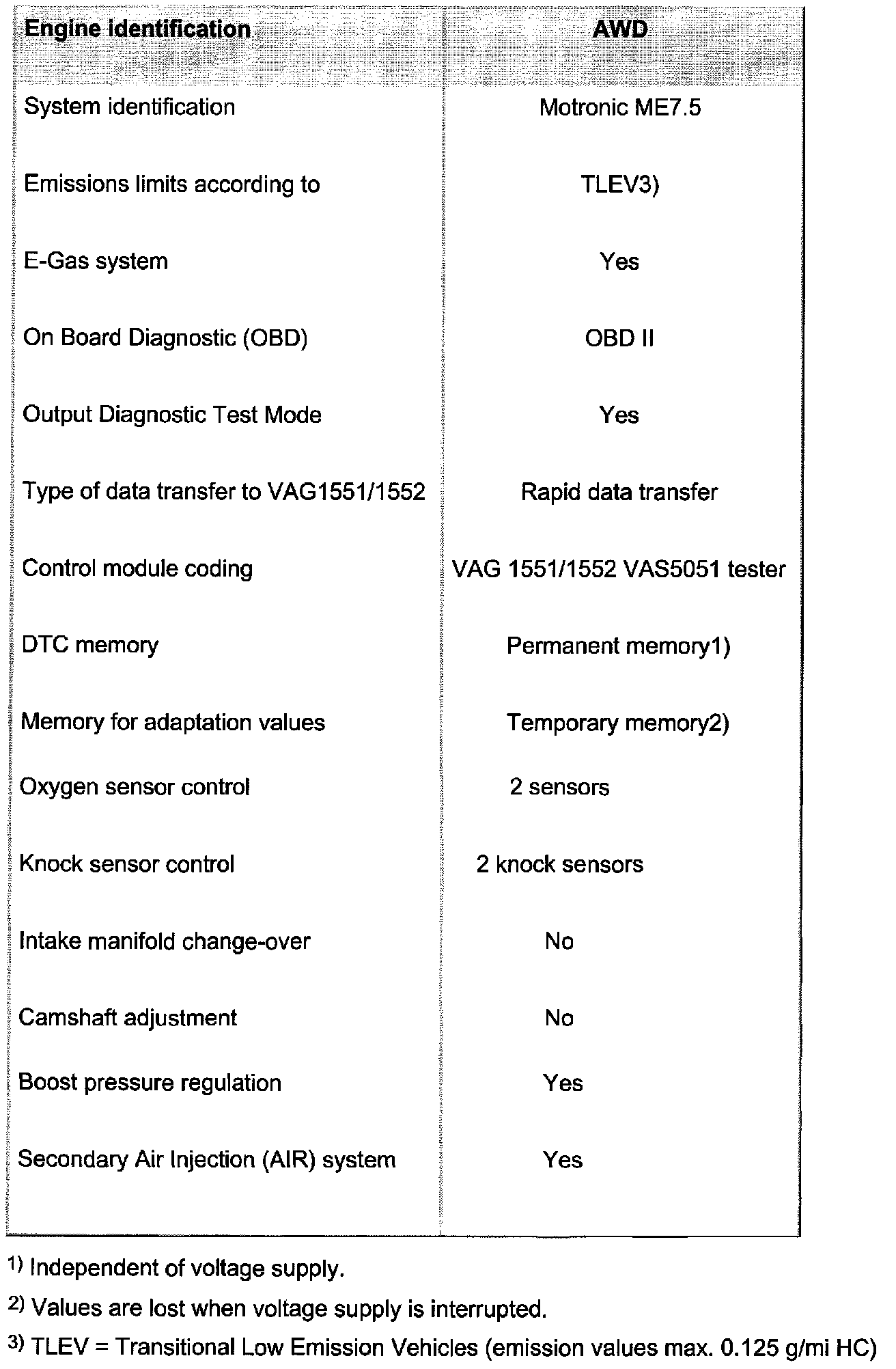 The control module version is identified when the VAG1551 Scan Tool, VAG1552 Scan Tool or the new VAS5051 tester are connected and the control module for engine electronics is selected. Refer to "VAG 1551 Scan Tool" [1][2][3][4][5]Connecting VAG 1551 Scan Tool