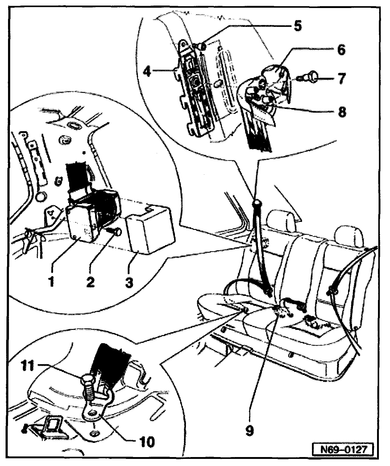 - Remove belt inertia reel -1- belt relay -8- and lower mount -10-.