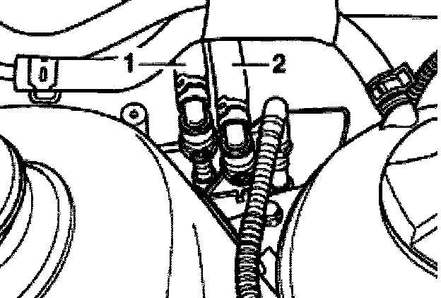 - Remove fuel supply hose -1- (with white mark) and return hose -2- (with blue mark) and catch any fuel with a clean cloth.