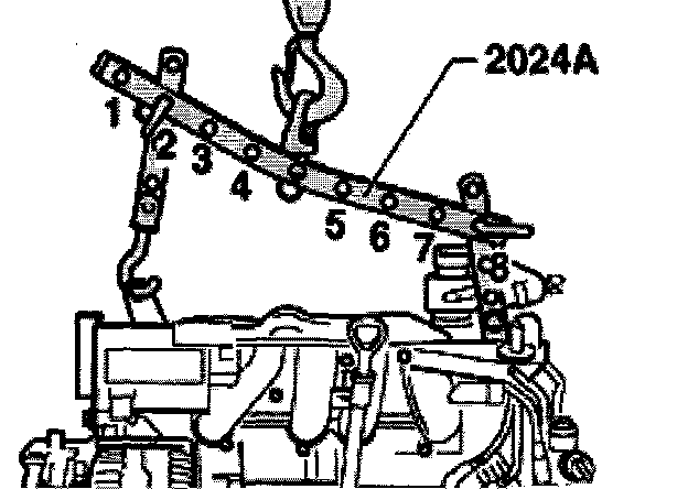 - Attach 2024A lifting tackle with 2024 Al1 extension as follows and lift out from engine/transmission jack V.A.G 1383/A using workshop crane: