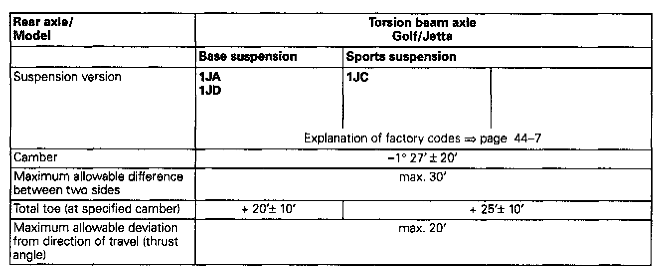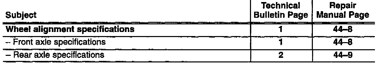 The alignment specification for rear axle camber has been revised to -1° 27 ' ± 20 '. The alignment specifications are reprinted here in their entirety.