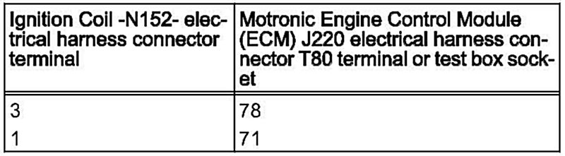 - Using a Multimeter , Check the Ignition Coil electrical harness connector to the Motronic Engine Control Module (ECM) -J220- electrical harness connector T80 for an open circuit.