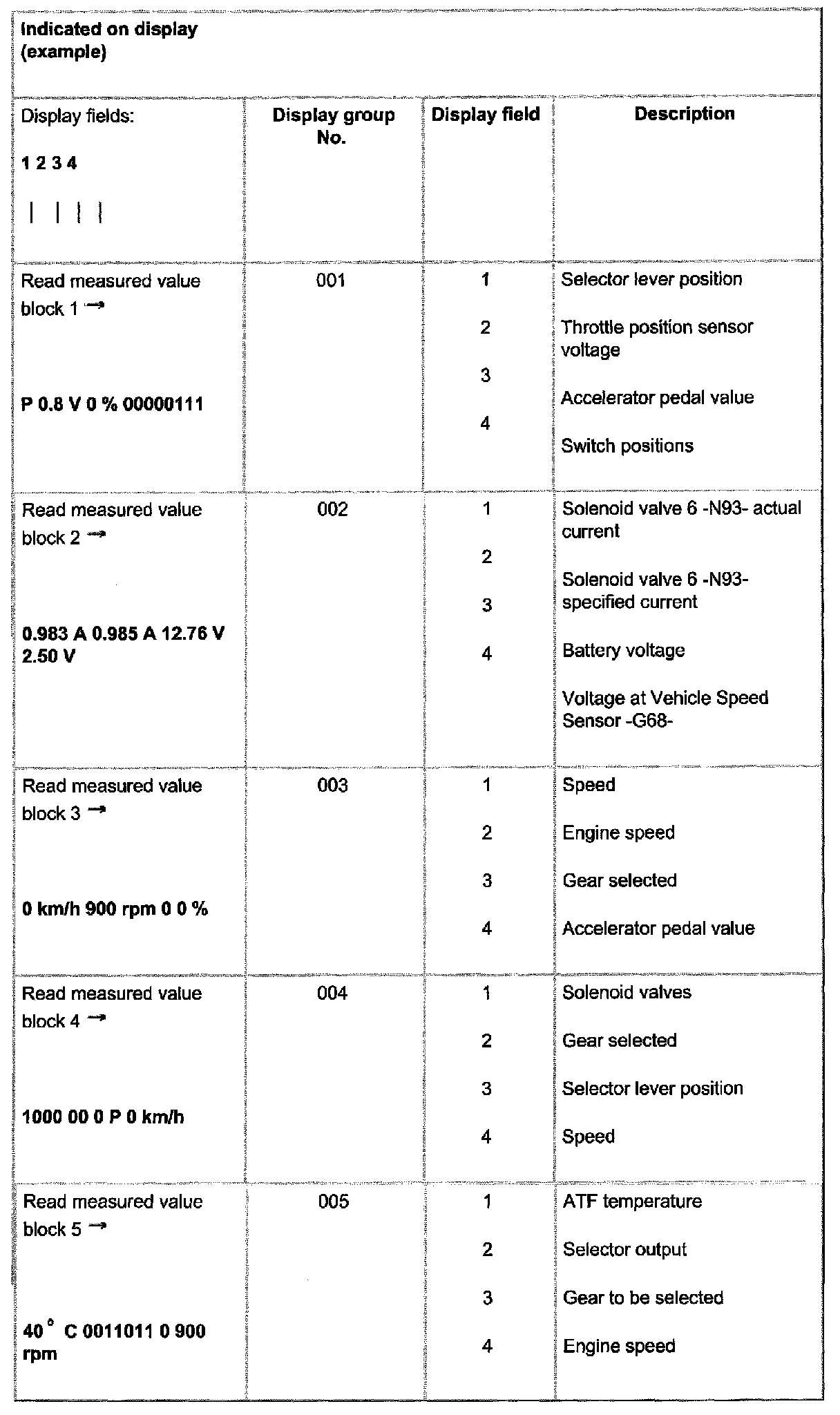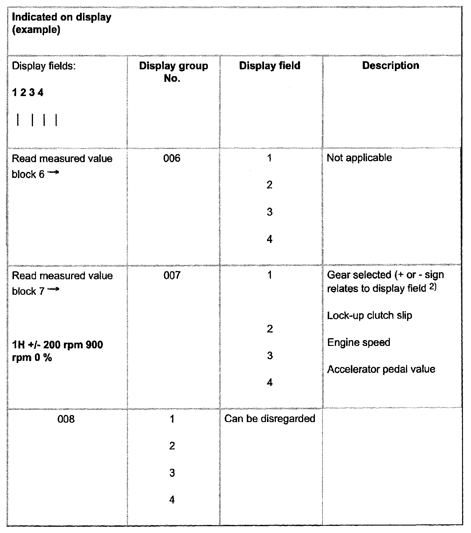 There are always 4 display fields in the measured value block (in actual physical quantities if necessary). Decoding the individual values in display fields 1 to 4 See Test table.