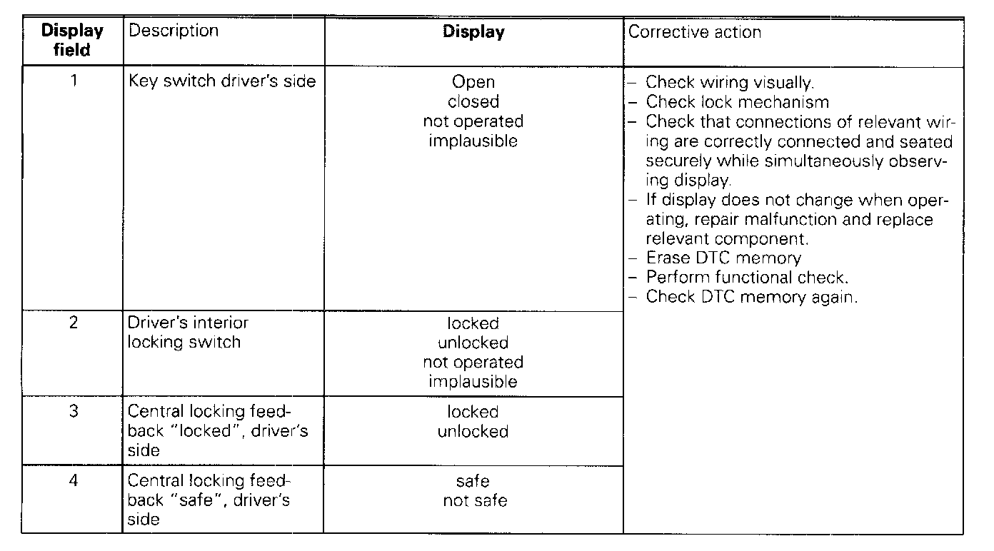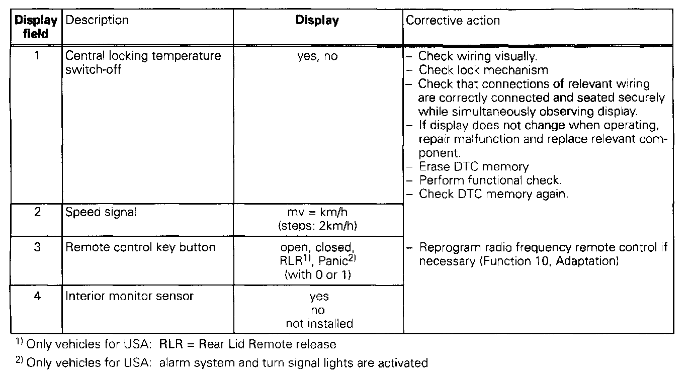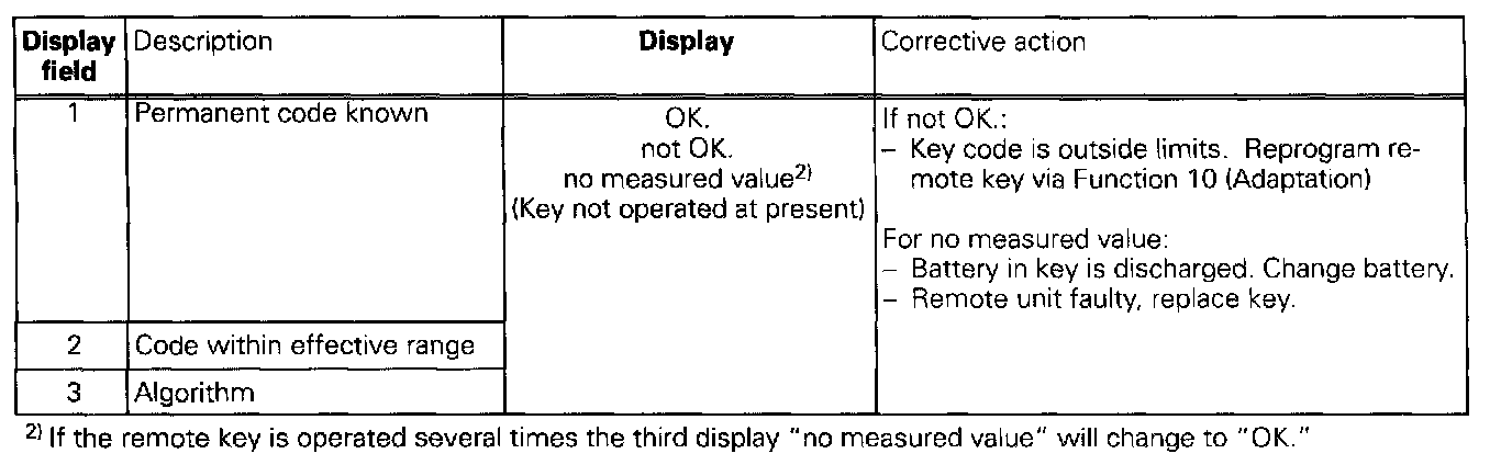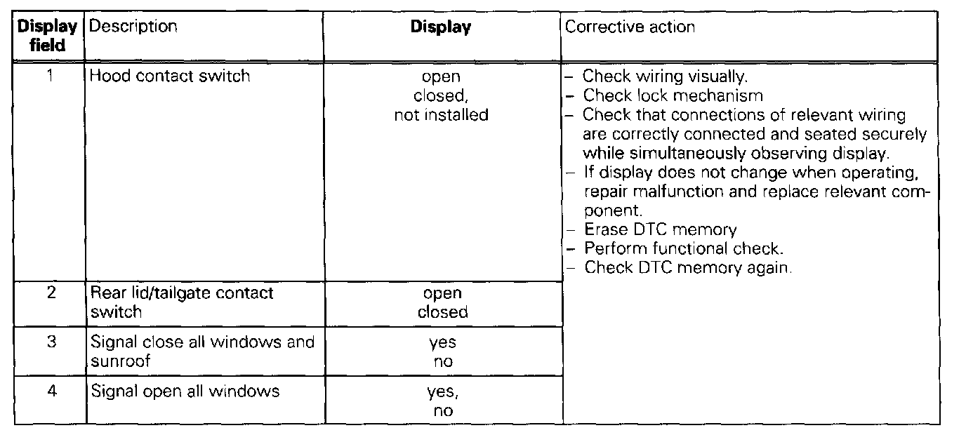 The measured values in "Read measured value block" and "Basic setting" are described during the individual component test. This table serves only as an overview.