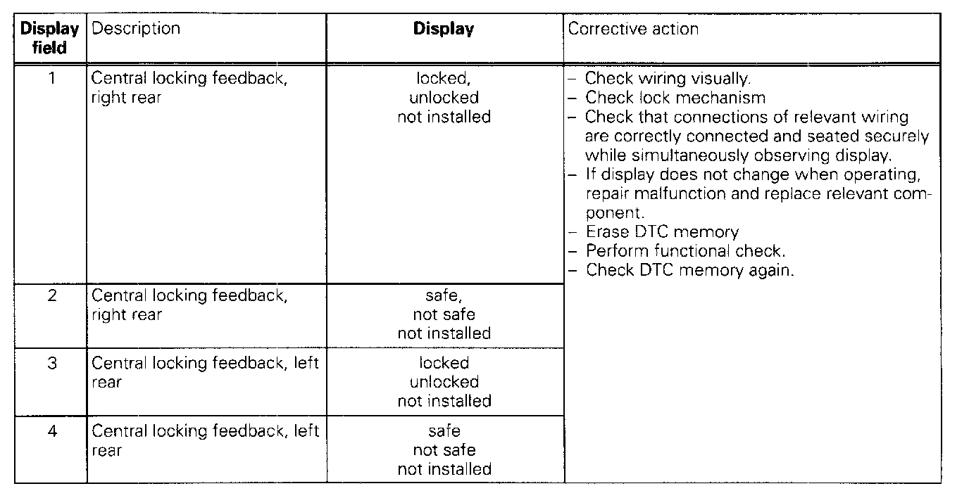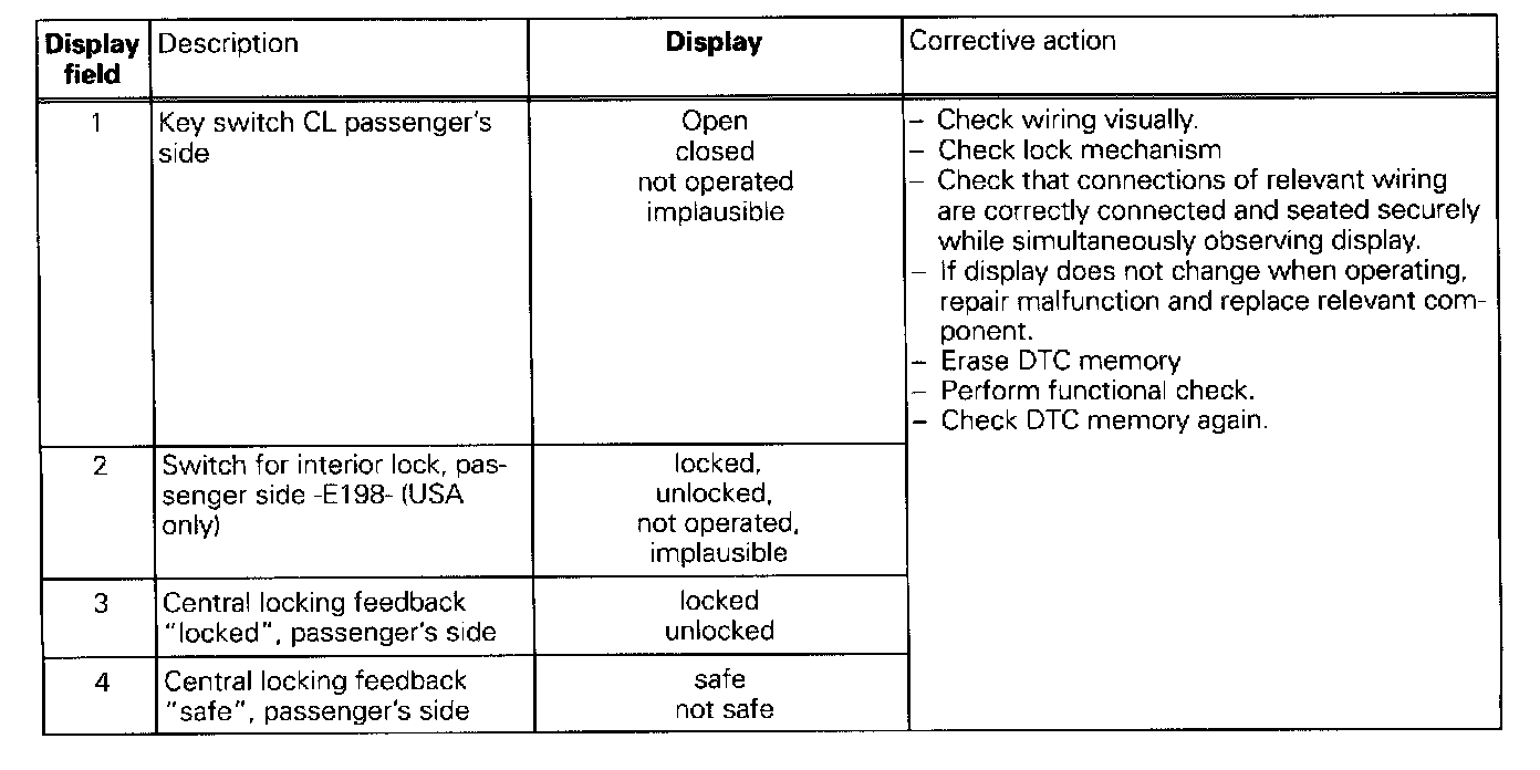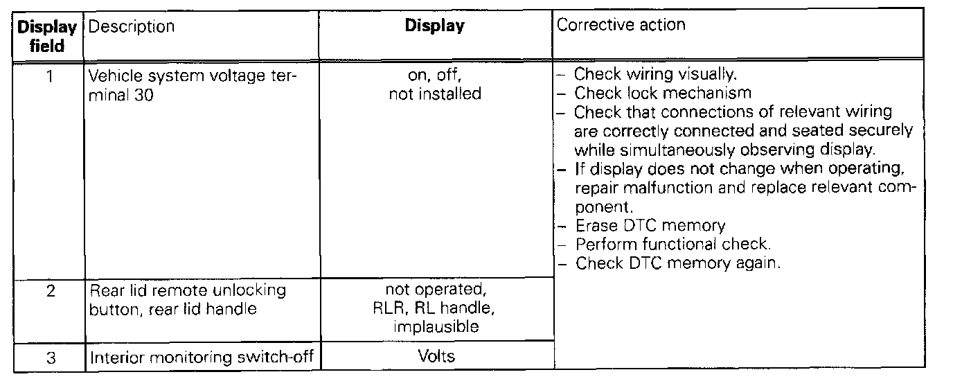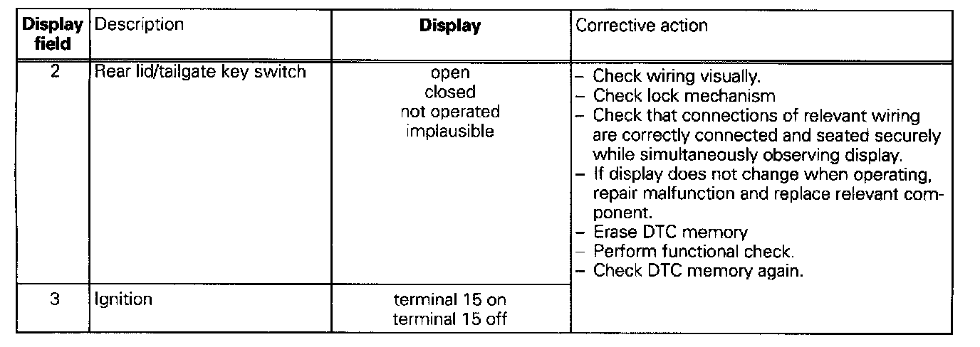 The measured values in "Read measured value block" and "Basic setting" are described during the individual component test. This table serves only as an overview.