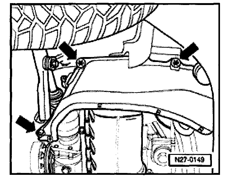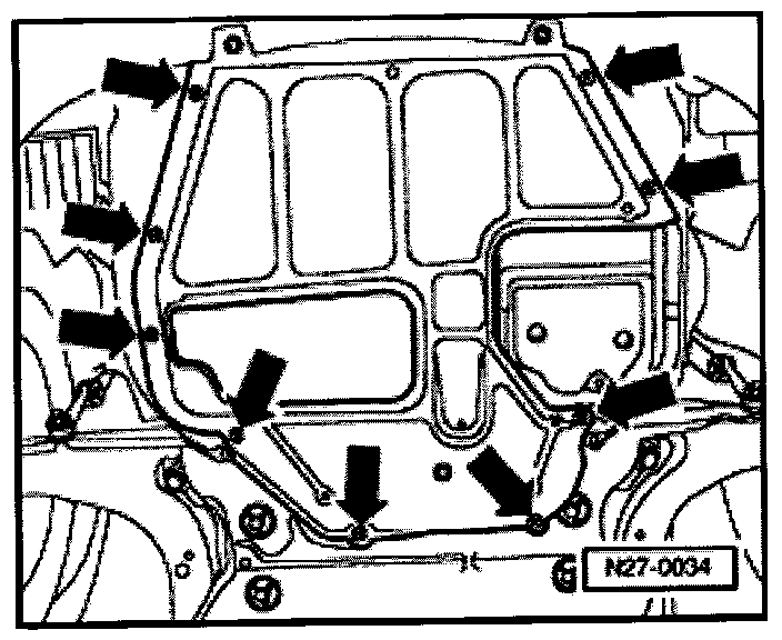 - Remove securing bolts -arrows- and remove the middle cover of the engine compartment noise insulation.