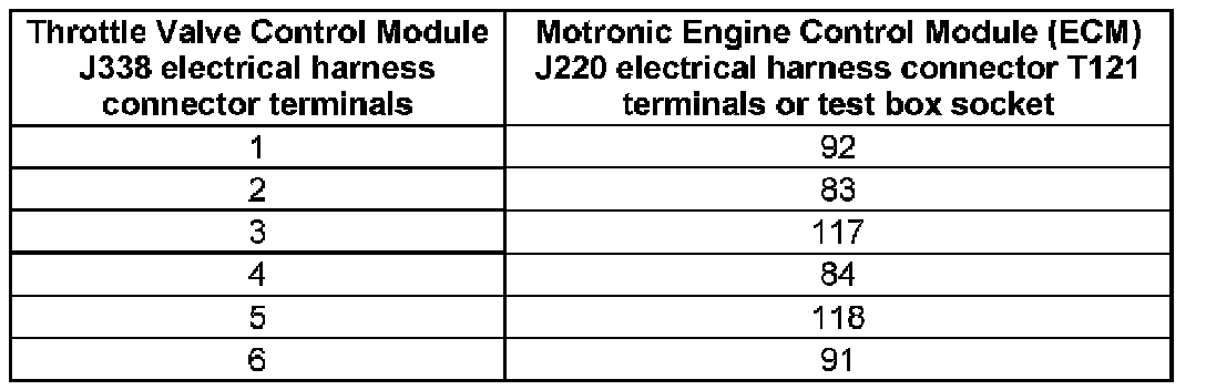 - Using a Multimeter, check the Throttle Drive (for Electronic Power Control (EPC)) G186 at Throttle Valve Control Module J338 electrical harness connector terminals to the Motronic Engine Control Module (ECM) J220 electrical harness connector T121 terminals for an open circuit according to the wiring diagram.