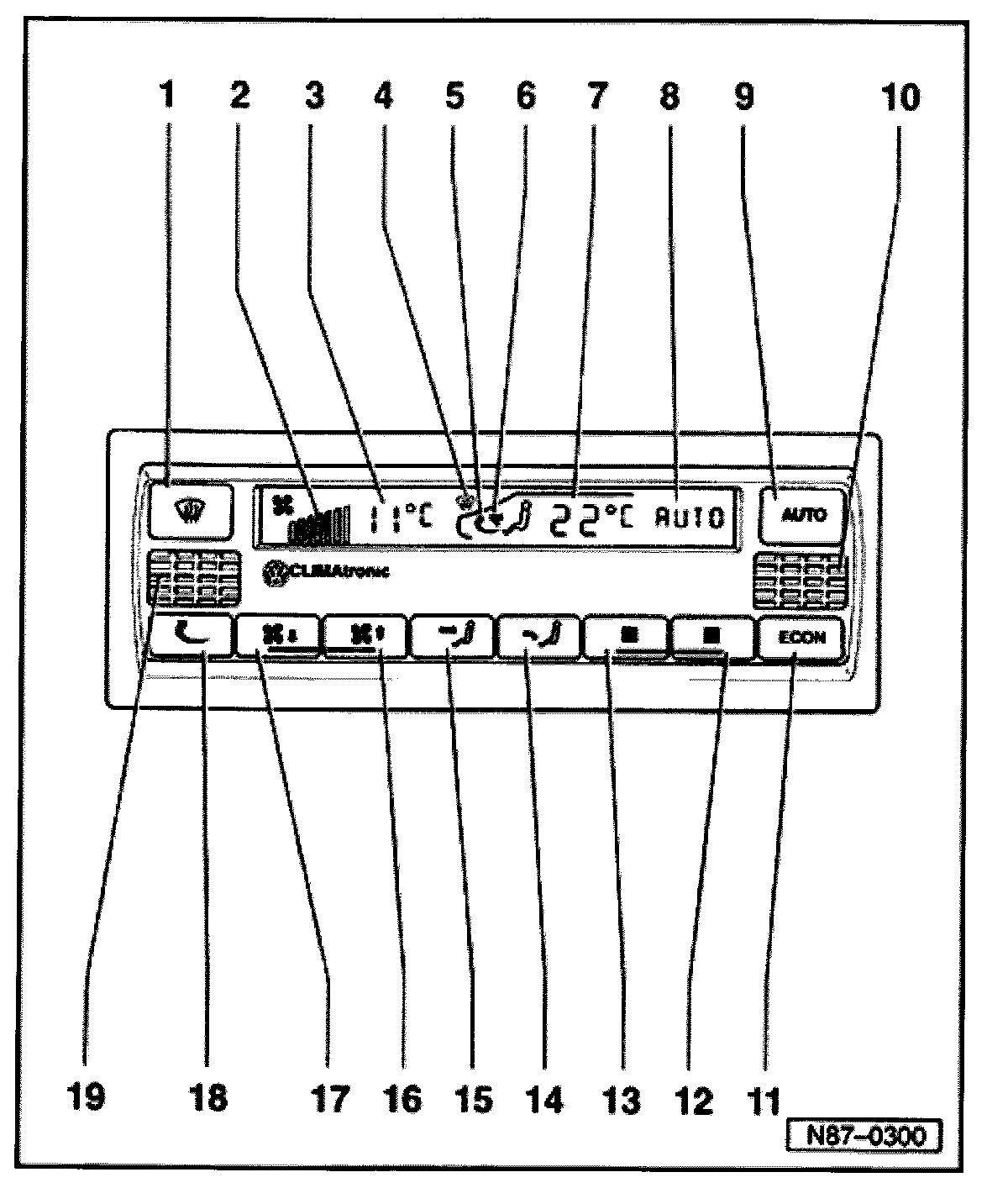 - Function "air flow to footwell" is displayed or goes out when pressing button -14-.