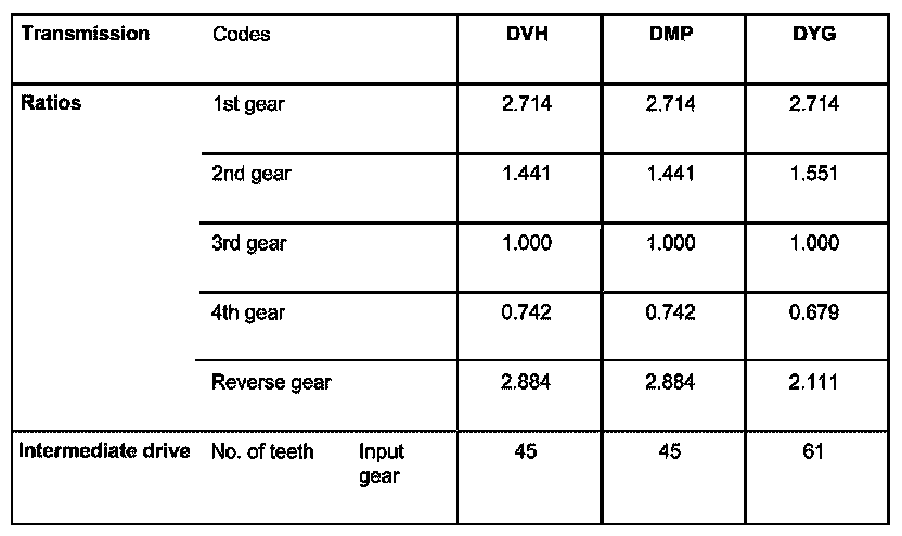 Code letters, transmission allocation, ratios, equipment (DVH, DMP, DYG Transmissions)