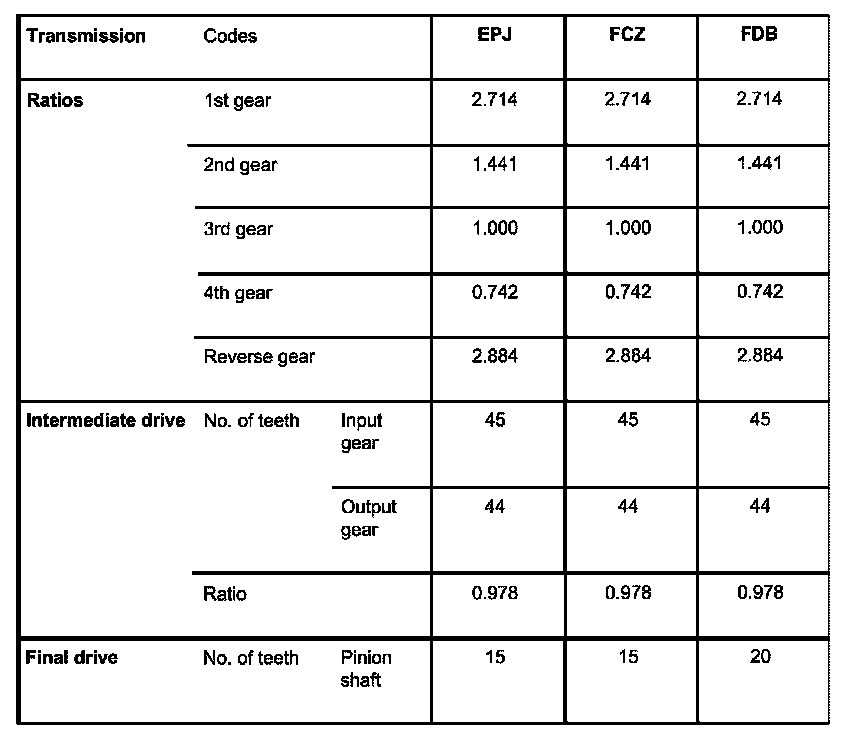 Code letters, transmission allocation, ratios, equipment (EPJ, FCZ, FDB Transmissions)