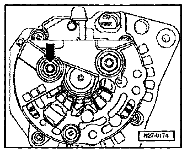 The tightening torque for the B+ wire -arrow- securing nut is 15 Nm.