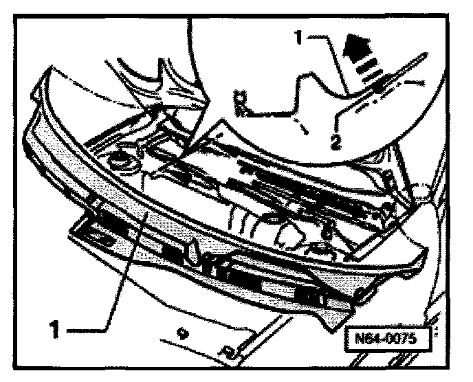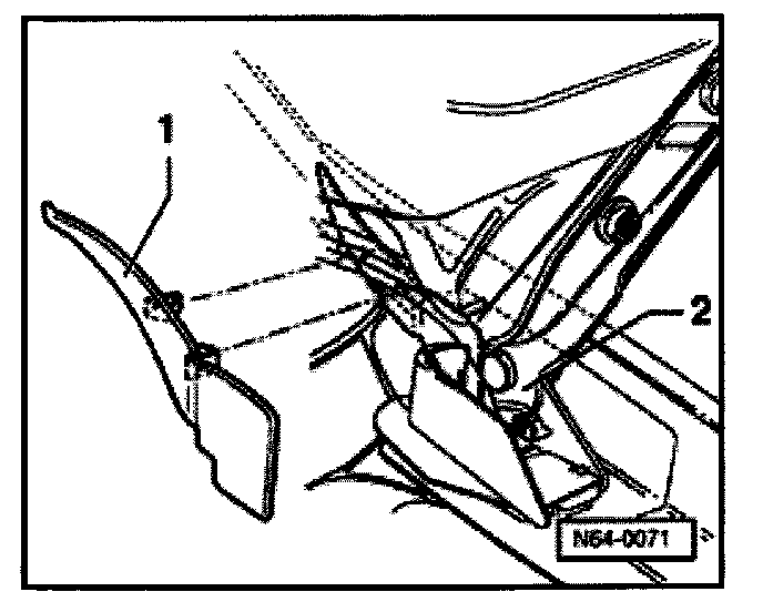 - Unclip trim -1- from inner side offender in area of hood hinge -2- on right and left sides.