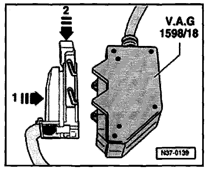 - Connect VAG 1598/18 test box to multi-pin connector -1- and lock in direction of arrow -2-