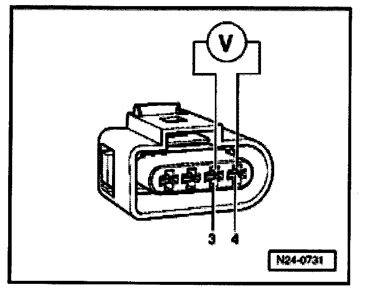 - Connect multimeter using auxiliary cables from VW1594 to measure voltage at terminals 3 + 4 (harness connector to Motronic Engine Control Module (ECM)).