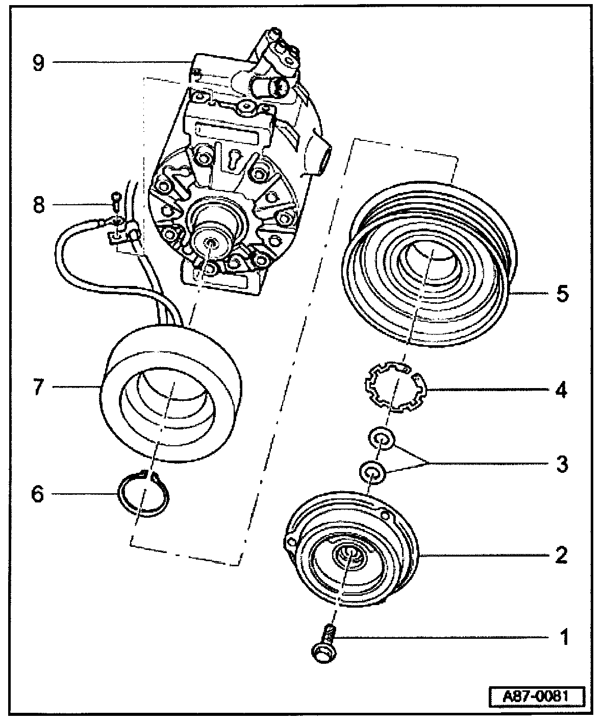 NOTE: A thermo-fuse is incorporated into the clutch coil. Current to the clutch coil is interrupted in the event of compressor overheating (e.g. a binding compressor).