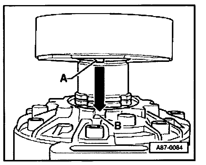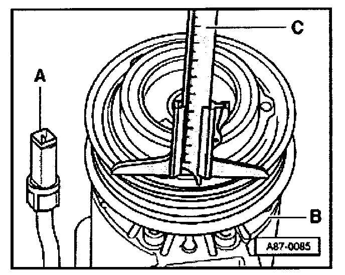 - Using depth gauge -C-, measure gap between top of clutch plate and belt pulley at three equally spaced locations (measurement must not deviate).