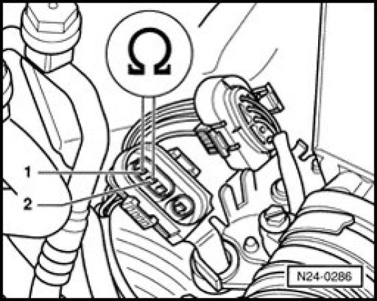 - Check resistance for sensor heater at connector to oxygen sensor terminal 1 + 2.