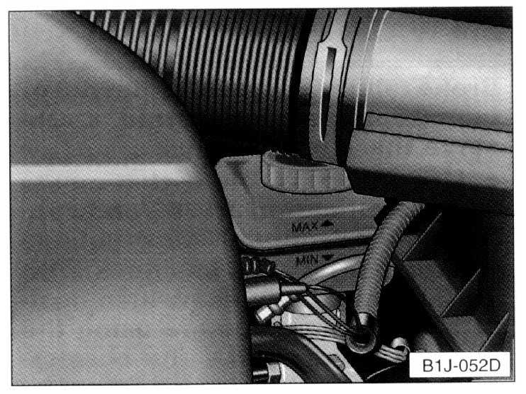 The correct fluid level is important for the proper functioning of the brake system. The fluid level in the brake fluid reservoir should always be between the "MAX" and "MIN" markings.