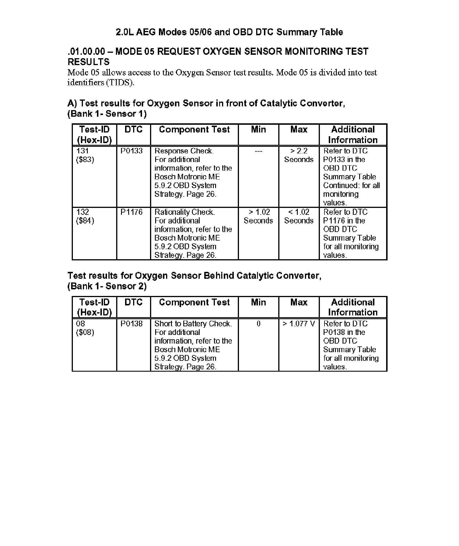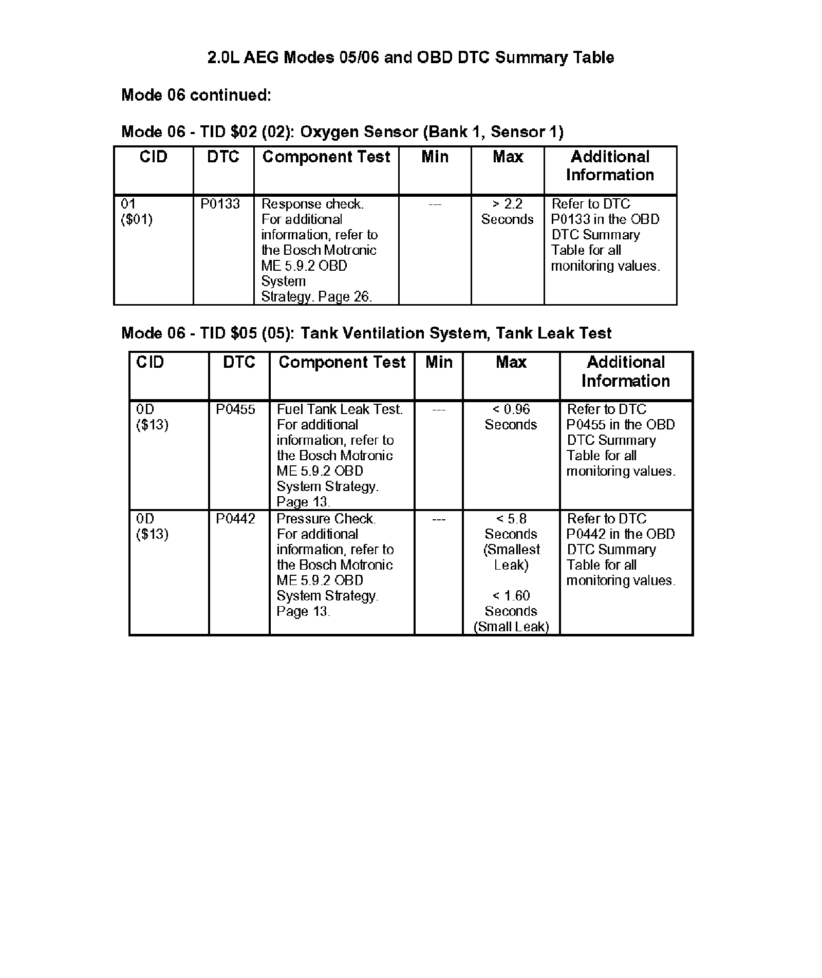 Modes 05/06 and OBD DTC Summary Table