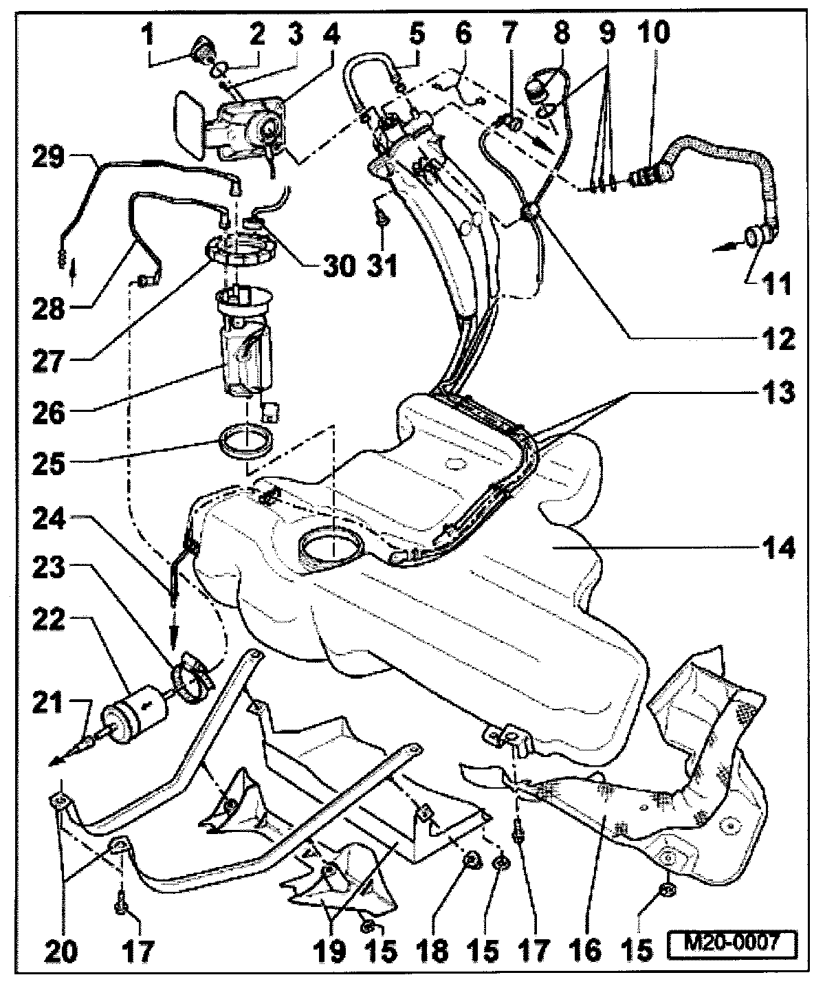 Markings on the sensor must agree with those on the fuel tank -arrows-.