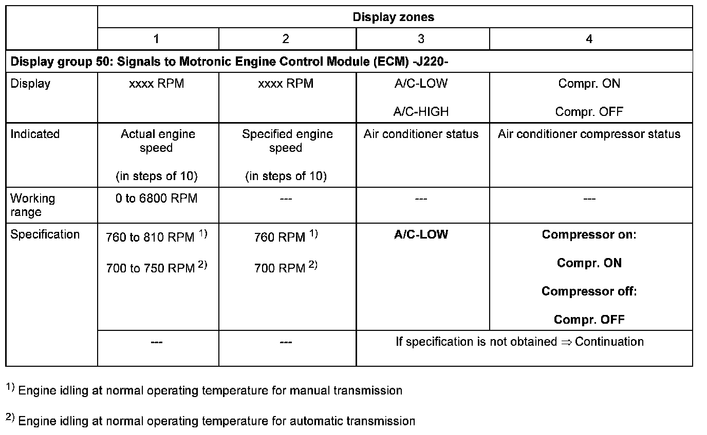 - Connect VAG 1551 scan tool ((VAG 1552). Start engine and select "Address word" 01 of Motronic Engine Control Module (ECM) -J220-. Engine must be running at idle speed.