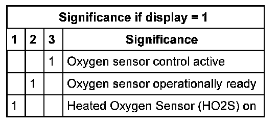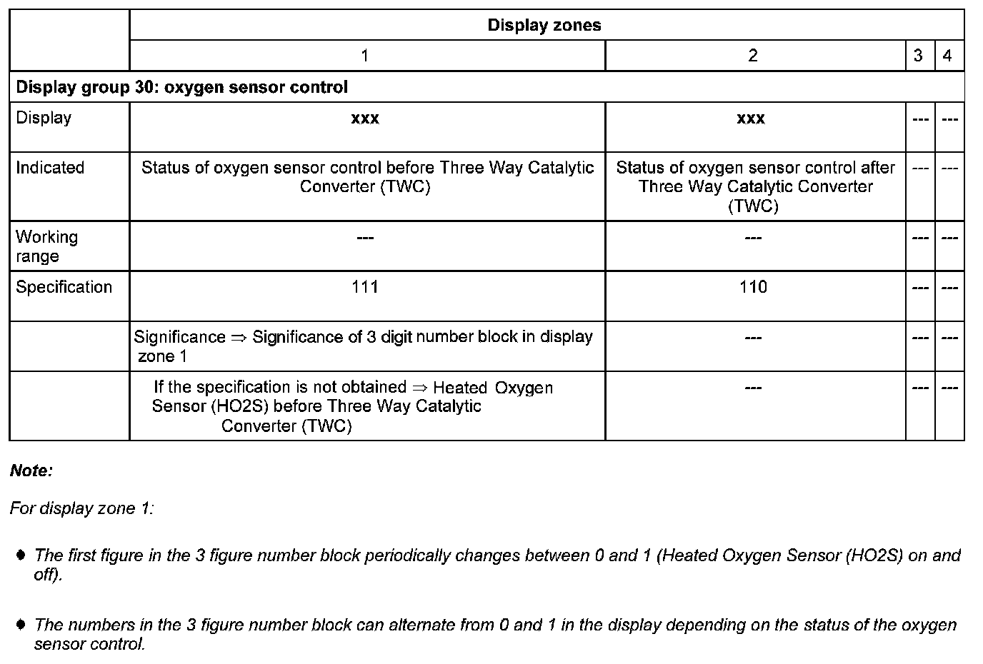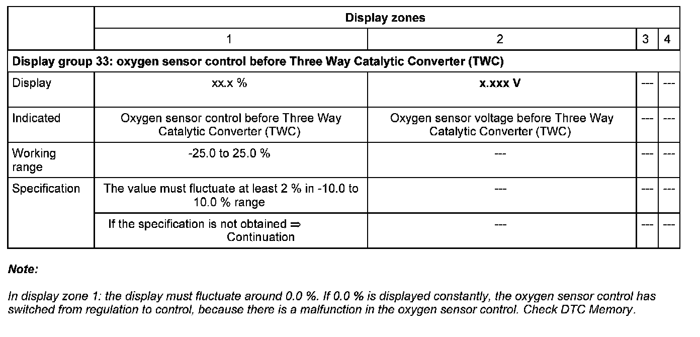 - Check status of the oxygen sensor control before Three Way Catalytic Converter (TWC) (display zone 1):