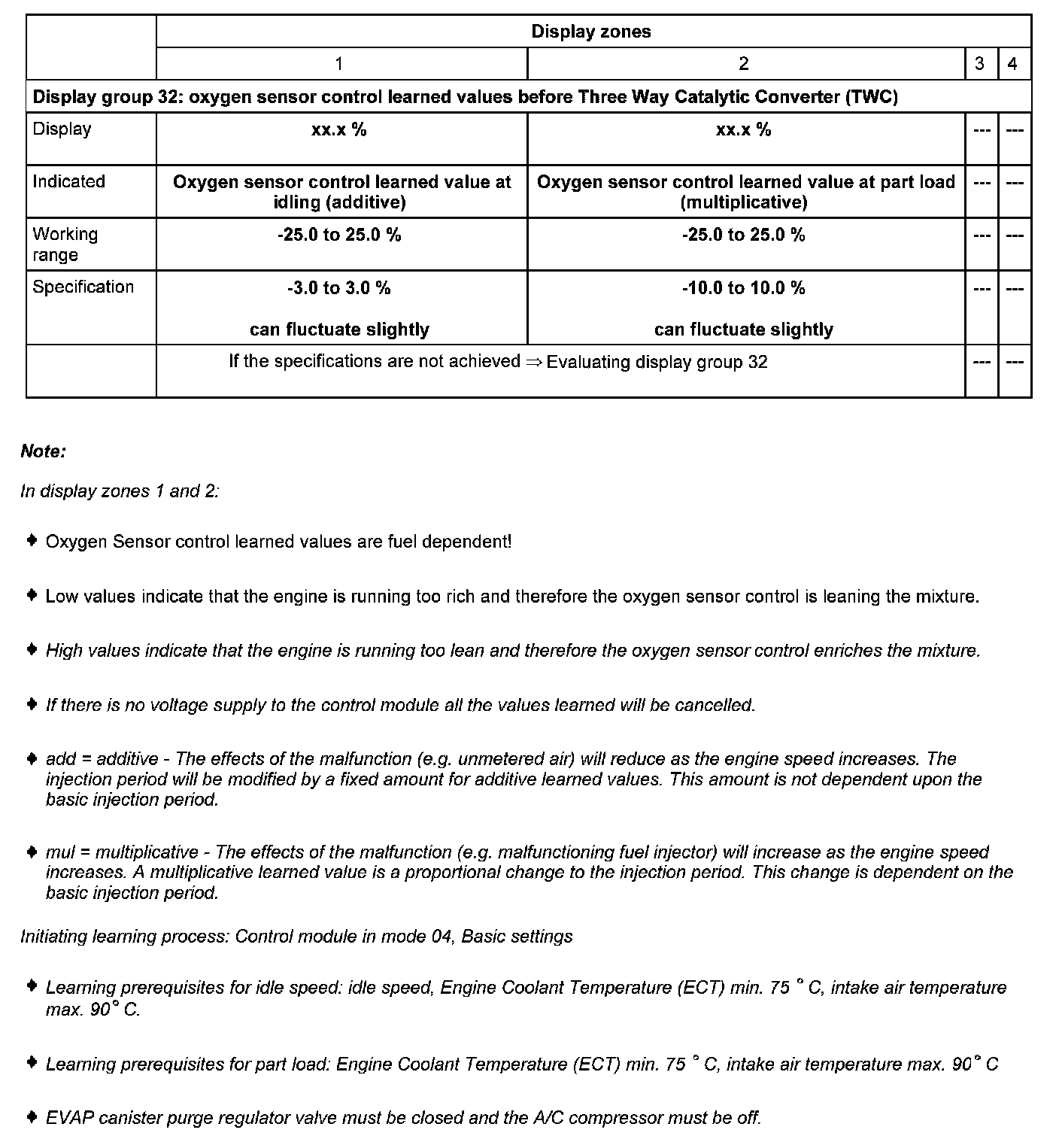 Evaluating display zone 33, display zones 1 - oxygen sensor control learned values before Three Way Catalytic Converter (TWC)