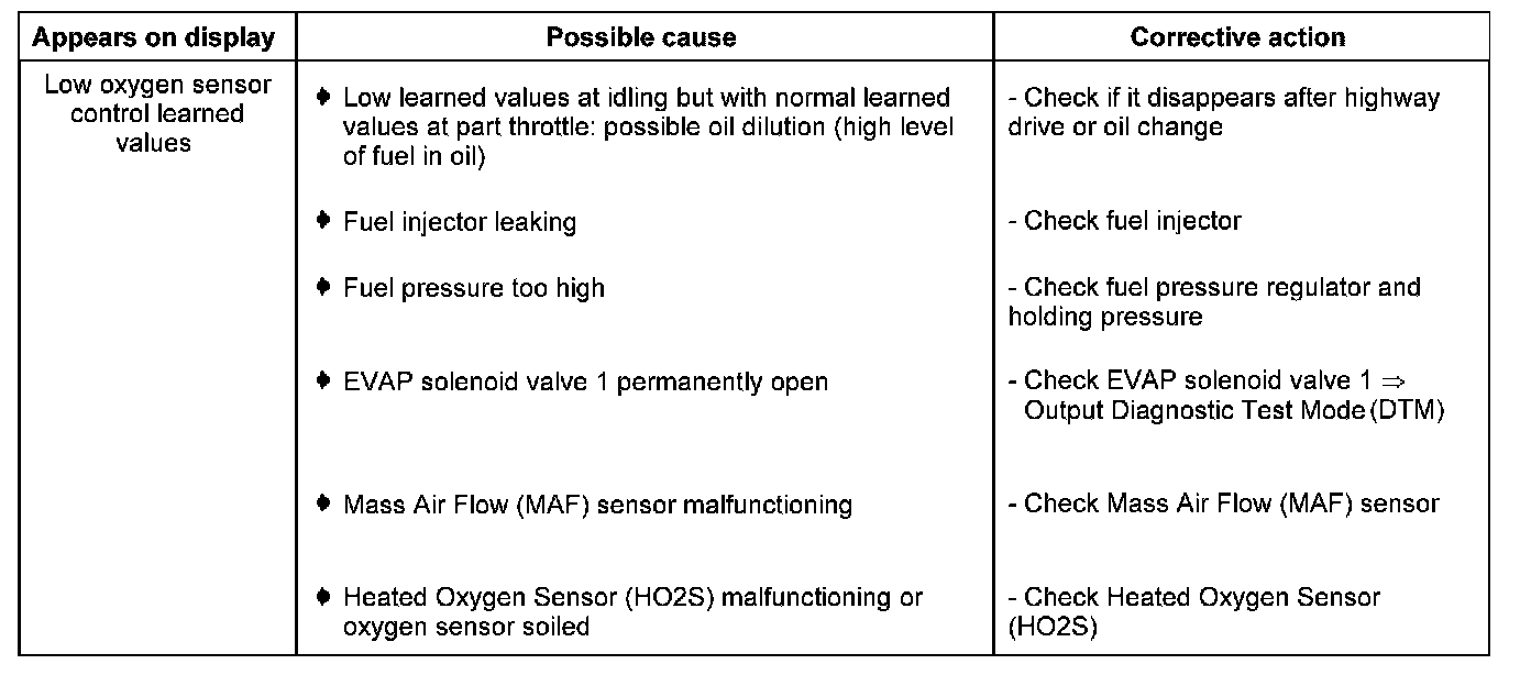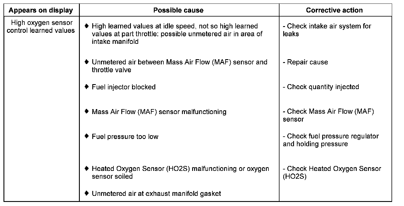 - Check oxygen sensor control learned values at idling speed (additive) in display zone 1.