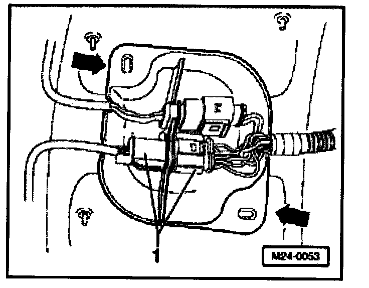 - Remove protective cover -arrows- and separate 6-pin connector (black) -1- to Heated Oxygen Sensor (HO2S) before Three Way Catalytic Converter (TWC) -G39-.