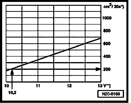 During test, a voltage of 12.5 volts is measured at battery. Since the voltage at the pump is approx. 2 volts less than battery voltage, there is a minimum delivery rate of 200 cubic cm/30 s.