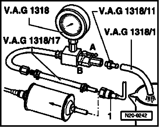 - Connect pressure gauge (VAG1318) to fuel supply line using adapters (VAG1318/23 and VAG1318/17).