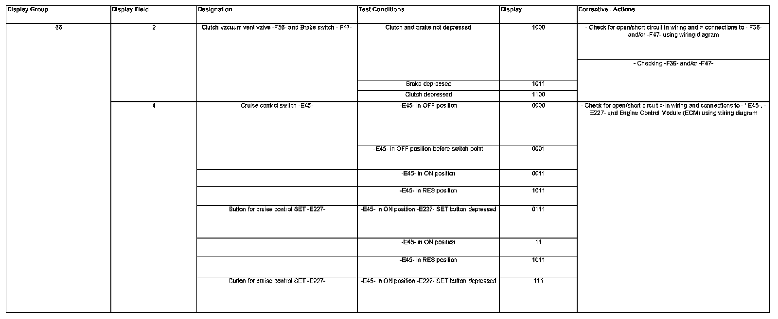 The operating status of the cruise control system, cruise control switches, brake and clutch switches can be checked using the procedure on the following pages: