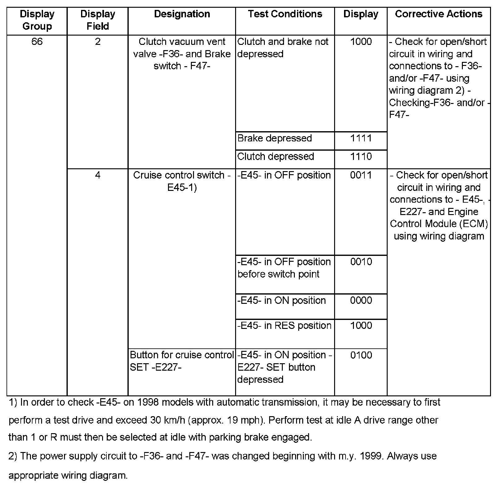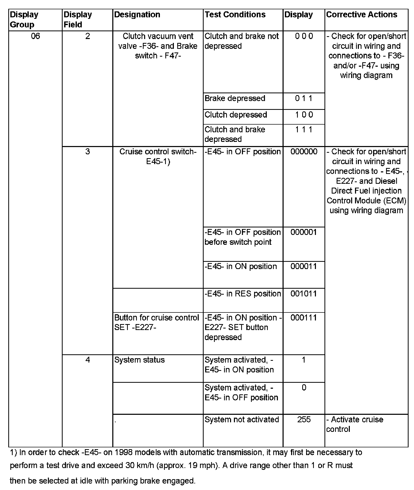 - On some 1998 model year vehicles with automatic transmission, the CCS switch is not supplied with voltage until the vehicle speed exceeds 30 km/h (approx. 19 mph) and the selector lever is in position B, 3 or 2. Once the switch has been supplied with voltage it will also remain live at idle, provided a driving range other than 1 or R is selected.