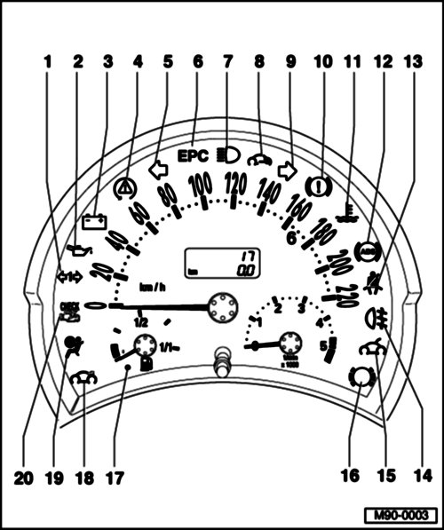 There are different instrument clusters depending on the vehicle equipment level. Therefore the location of the indicator lamps and analog displays may differ from the illustration.