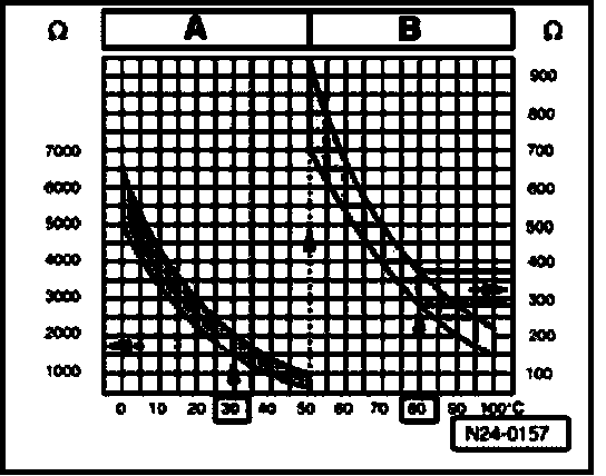 Range A displays resistance values for the temperature range of 0...50 degrees C, range B displays resistance values for the temperature range of 50...100 degrees C.