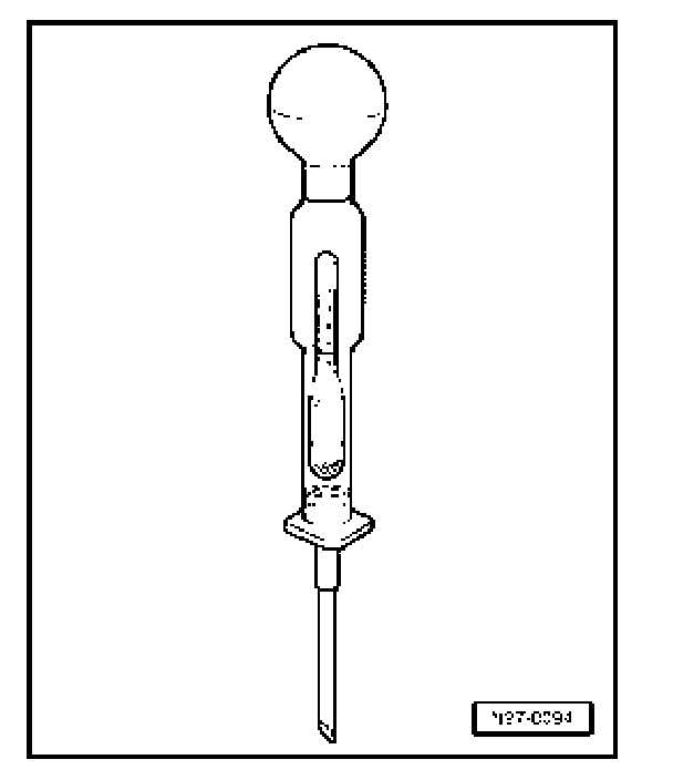 - If electrolyte level is too low, fill up to max. marking with distilled water using battery filling bottle VAS 5045 or equivalent.