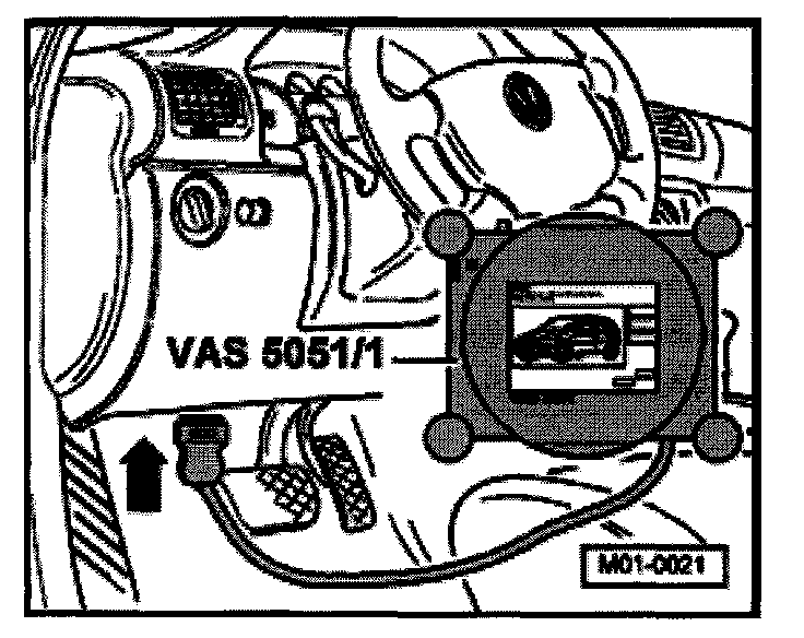 - Plug connector of diagnosis cable VAS 5051/1 or VAS 5051/3 to Data Link Connector (DLC)(arrow).
