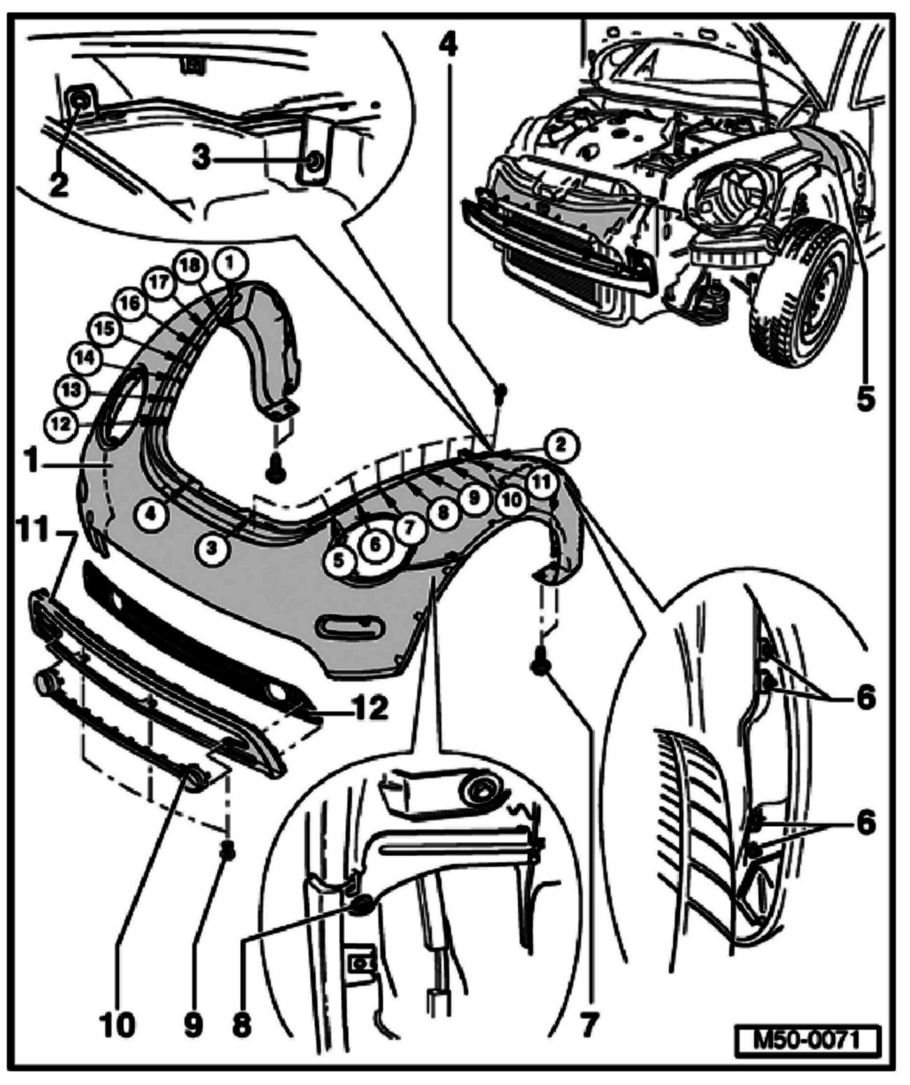 Note: The front fenders and the front bumper cover can only be removed together from the vehicle, as the so named Front part. The front part must be installed free of stress.