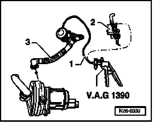 - Disconnect vacuum hose -1- at Secondary Air Injection (AIR) Solenoid Valve -N112- -2-.