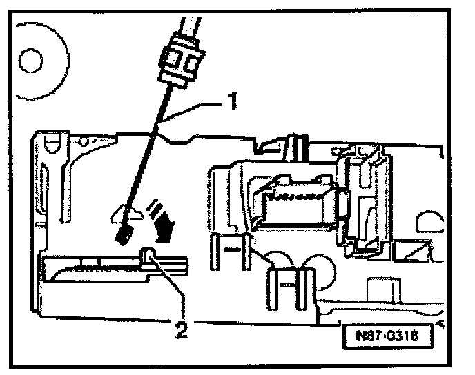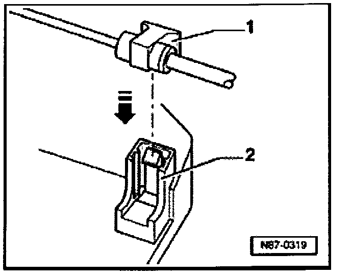 - Press footwell/defrost or central flap cable -1- into mount -2- until it engages.