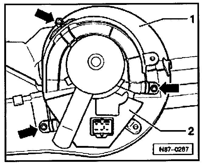 - Insert fresh air blower with blower control unit -2- into housing -1- and secure with screws -arrows-.