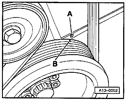 The mark on the toothed belt guard -A- must align with the notch on the ribbed belt pulley -B-.