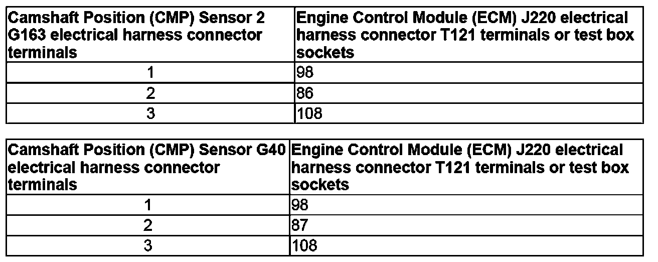 Using a Multimeter, Check the Camshaft Position (CMP) Sensor G40 or Camshaft Position (CMP) Sensor 2 G163 electrical harness connector to the Engine Control Module (ECM) J220 electrical harness connector for an open circuit.