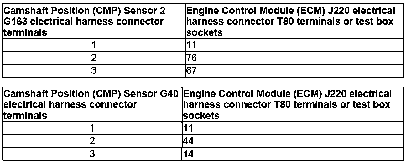 The following procedure is used to diagnose both Camshaft Position (CMP) Sensor G40 and Camshaft Position (CMP) Sensor 2 G163