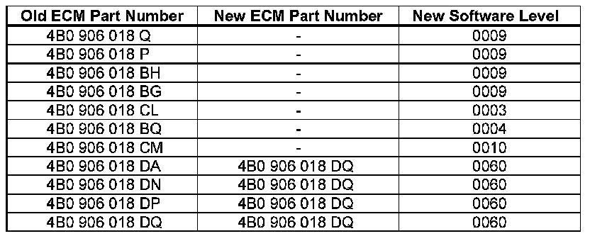 - If ECM matches table, no software update is required; otherwise proceed to next step