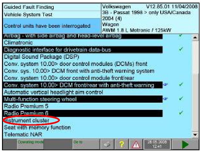- If GFF did not highlight the control unit, select Instrument cluster manually to interrogate control unit -circle-
