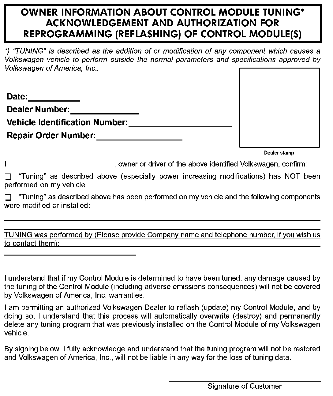 - Notify the owner any damage caused by the tuning of the ECM or TCM (including any adverse emissions consequences) will not be covered by Volkswagen of America, Inc. warranties